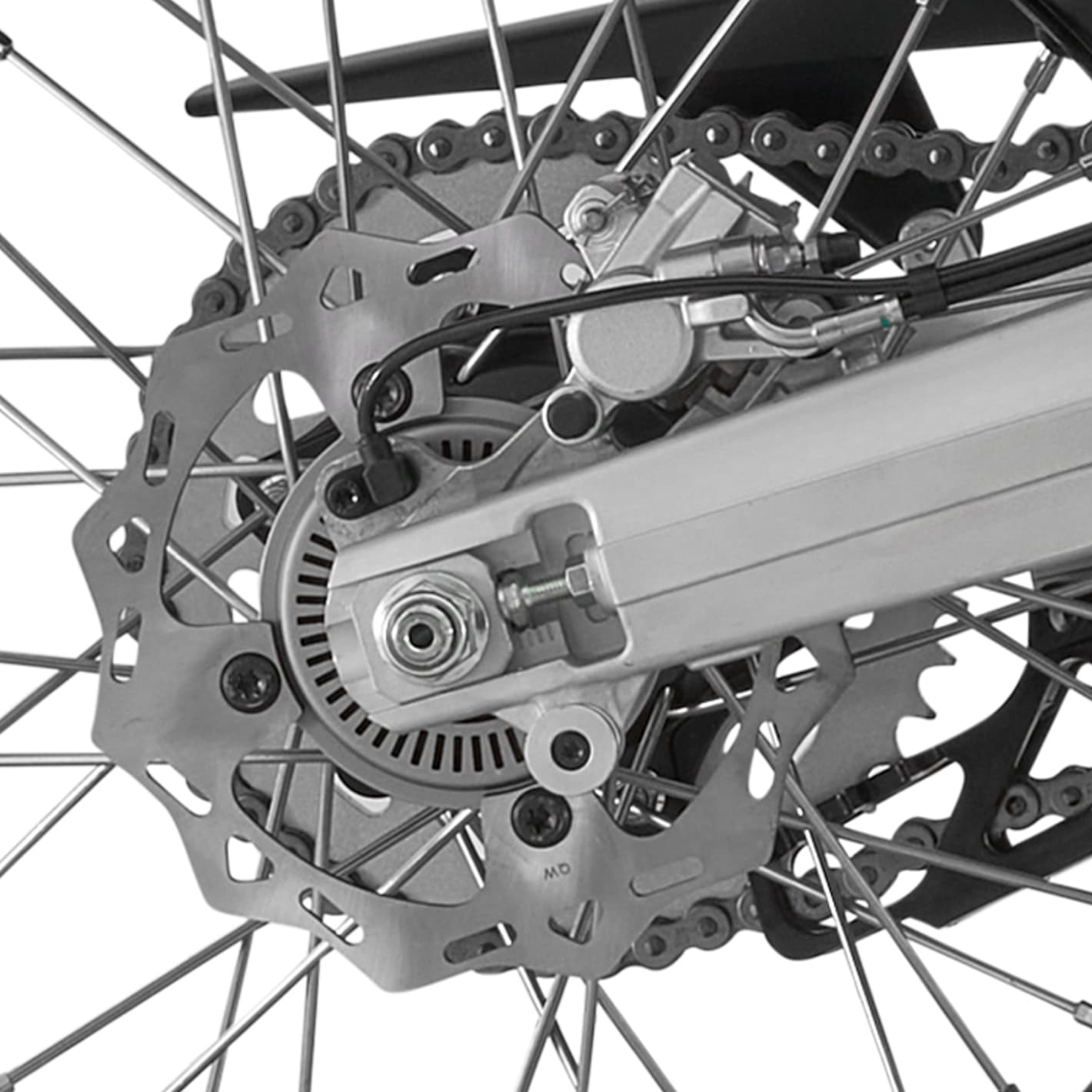 Disco delantero de Ø300 mm con sistema ABS, diseñado para ofrecer una frenada potente, estable y progresiva en cualquier situación. Su diámetro amplio mejora la disipación térmica y reduce la fatiga en uso prolongado, proporcionando seguridad tanto en asfalto como en terrenos más irregulares.